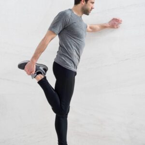 Flexiona tu pierna hasta que tu talón toque tu nalga. Haz lo mismo con tu otra pierna. Mantén tu cuerpo recto y cuenta hasta 30 segundos. Inspira y expira normal. (3 repeticiones por pierna)